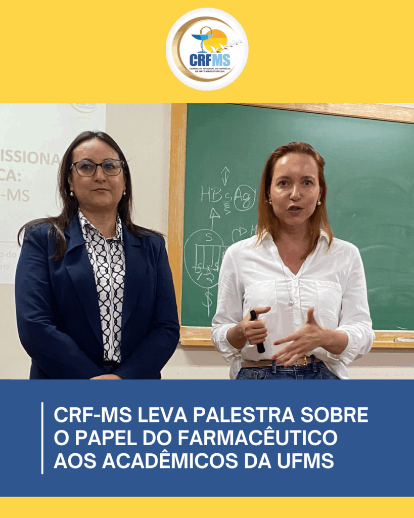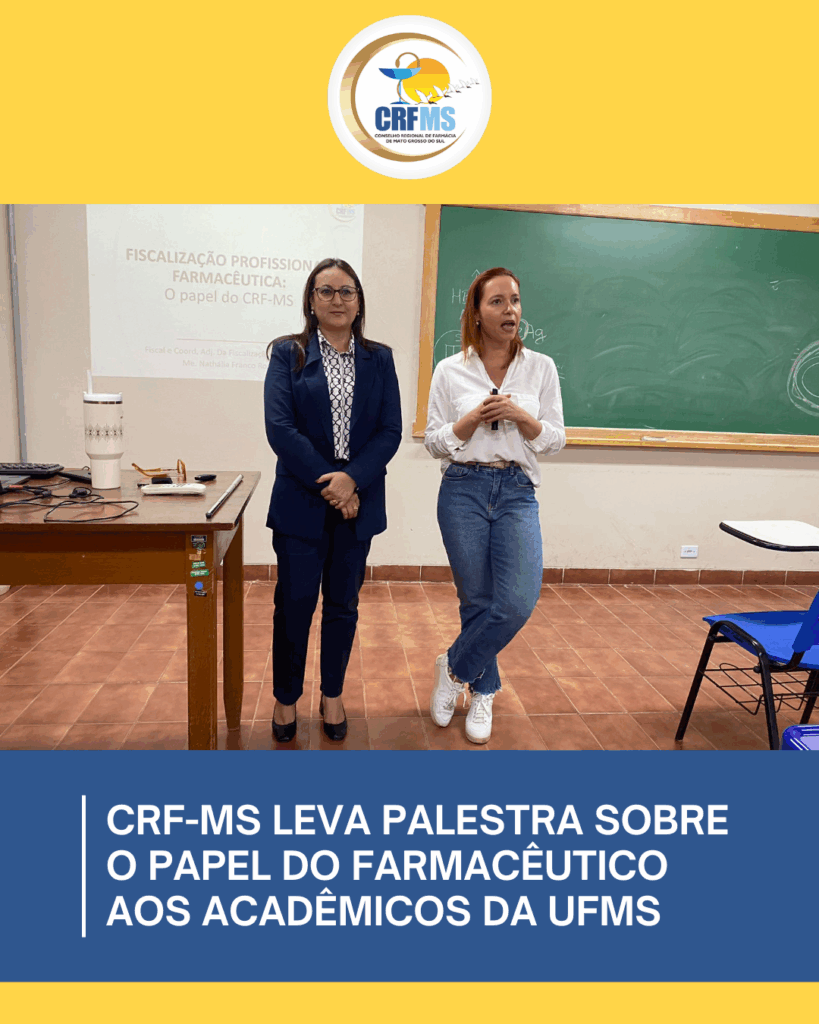 Nesta manhã (18), a presidente do CRF-MS, Daniely Proença, e a coordenadora adjunta da Fiscalização, Nathalia Roriz, estiveram na Universidade Federal de Mato Grosso do Sul (UFMS) para uma palestra especial voltada aos acadêmicos de Farmácia.